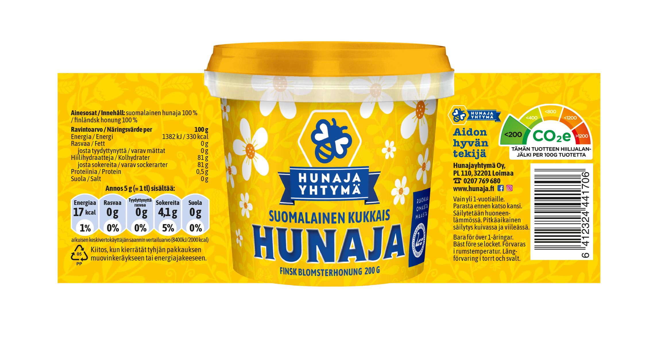 Suomen suosituin suomalainen kukkaishunaja on nyt saatavilla myös pienessä purkissa. 200 grammainen pikkupurkki sopii mukaan retkelle, mökille, kotiin tai herkkupäivän lahjaksi. Pienempi pakkaus on myös näppärä ruoanlaittoon, jos haluat kokeilla eri hunajien makuja ruokien ainesosina.