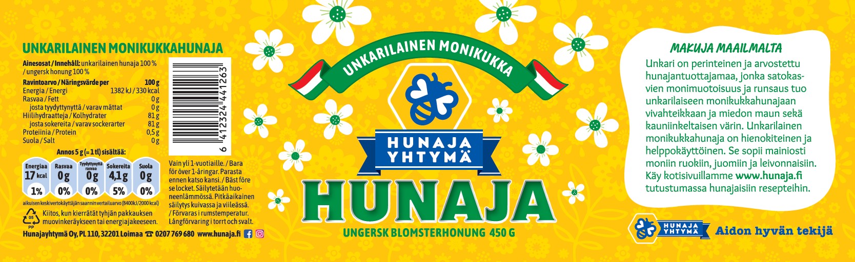 Kotimaisen hunajan lisäksi Hunajayhtymä purkittaa myös laadukasta unkarilaista monikukkahunajaa. Unkarilainen monikukkahunaja on mieto ja kauniin keltainen hunaja merkittävästä hunajantuottajamaasta. Unkarilainen hunaja on muokattu hienokiteiseksi, pehmeäksi ja helppokäyttöiseksi.