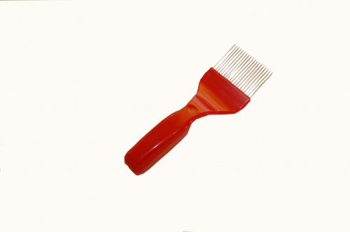 Tukevalla otinosalla varustettu kuorimahaarukka vahan kuorintaan hunajakakkujen päältä. Kädensija on muovinen.